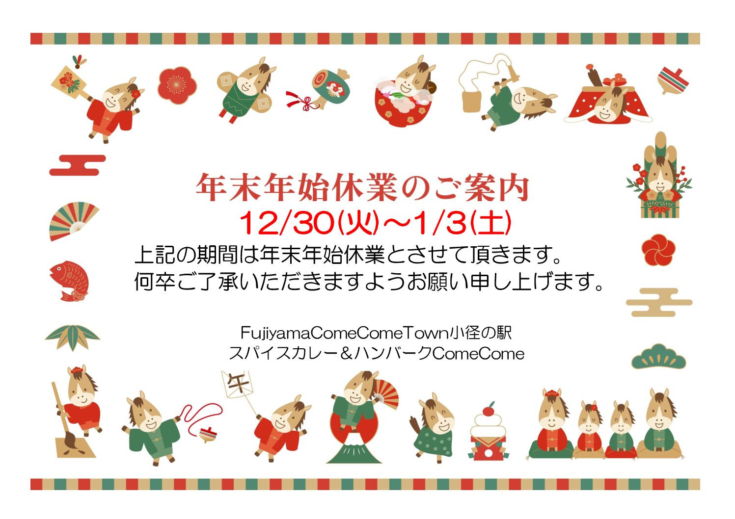 年末年始休業のご案内 12/30(火)~1/3(土) 上記の期間は年末年始休業とさせて頂きます。 何卒ご了承いただきますようお願い申し上げます。 FujiyamaComeComeTown 小径の駅 スパイスカレー&ハンバ […]